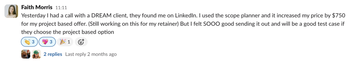 Jess loved using the Minimum Viable Rate tools to help her calculate her earning potential, as well as using our scope of work templates to create detailed deliverables before selling her offers.