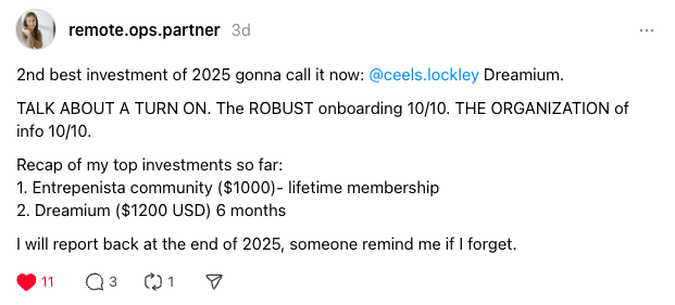 ”The minute I began my onboarding into Dreamium I knew I made the right decision. It was FLAWLESS from getting set up, preparing for weekly calls, accessing the materials and having access to Ceels in the Slack channel.”