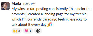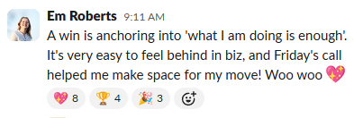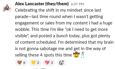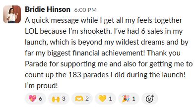 For the full 10 days of our sprint, I'll be showing up daily to kick your ass, pep talk you via the private podcast and in Slack so you KEEP GOING, do the work and SELL YOUR DAMN OFFER 🔥. Last Parade also saw more than 40 people logging on daily and cheering each other on because accountability really helps you stay on track!
