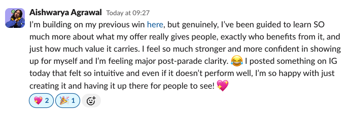 For the full 14 days of our sprint, I'll be showing up daily to kick your ass, pep talk you via the private podcast and in Slack so you KEEP GOING, do the work and SELL YOUR DAMN OFFER π₯. Last Parade also saw more than 40 people logging on daily and cheering each other on because accountability really helps you stay on track!